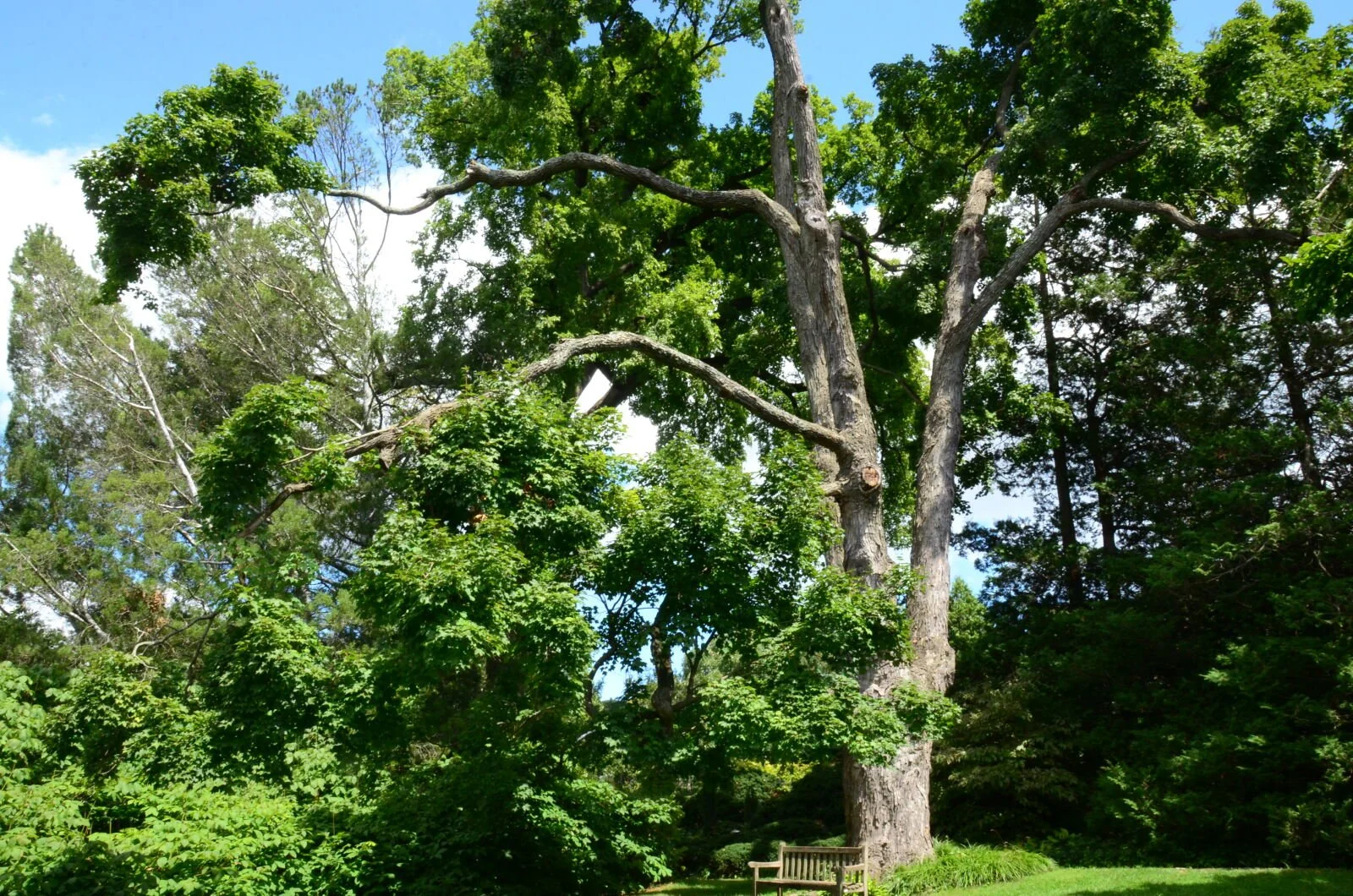 About: The sugar maple at Wave Hill is located south of the Shade Border and west of the Aquatic Garden. The exact age of the tree is unknown; it may have been planted by the estate owners or could have been a wild sapling that grew naturally. Wave Hill estimates that this tree started growing sometime in the early to mid-1800s, making it close to 200 years old. Its bark exhibits the characteristic plates of old sugar maples. A bench sits underneath this tall tree, offering a lovely view of the surrounding specimens and Wave Hill House. This tree has lost numerous limbs over the years, giving it a slender appearance.